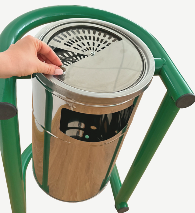 Урна-попільничка виконана з нержавіючої сталі марки AISI 430. Має циліндричну форму з гладкою поверхнею, виконану з нержавіючої сталі. Вона встановлена на зеленій підставці, що забезпечує стійкість. Верхня частина обладнана знімним кільцем і сіточкою для гасіння недопалків. Бічний отвір призначений для викидання сміття. Хромований блиск додає сучасного вигляду, а нержавіюча сталь забезпечує довговічність та стійкість до погодних умов.